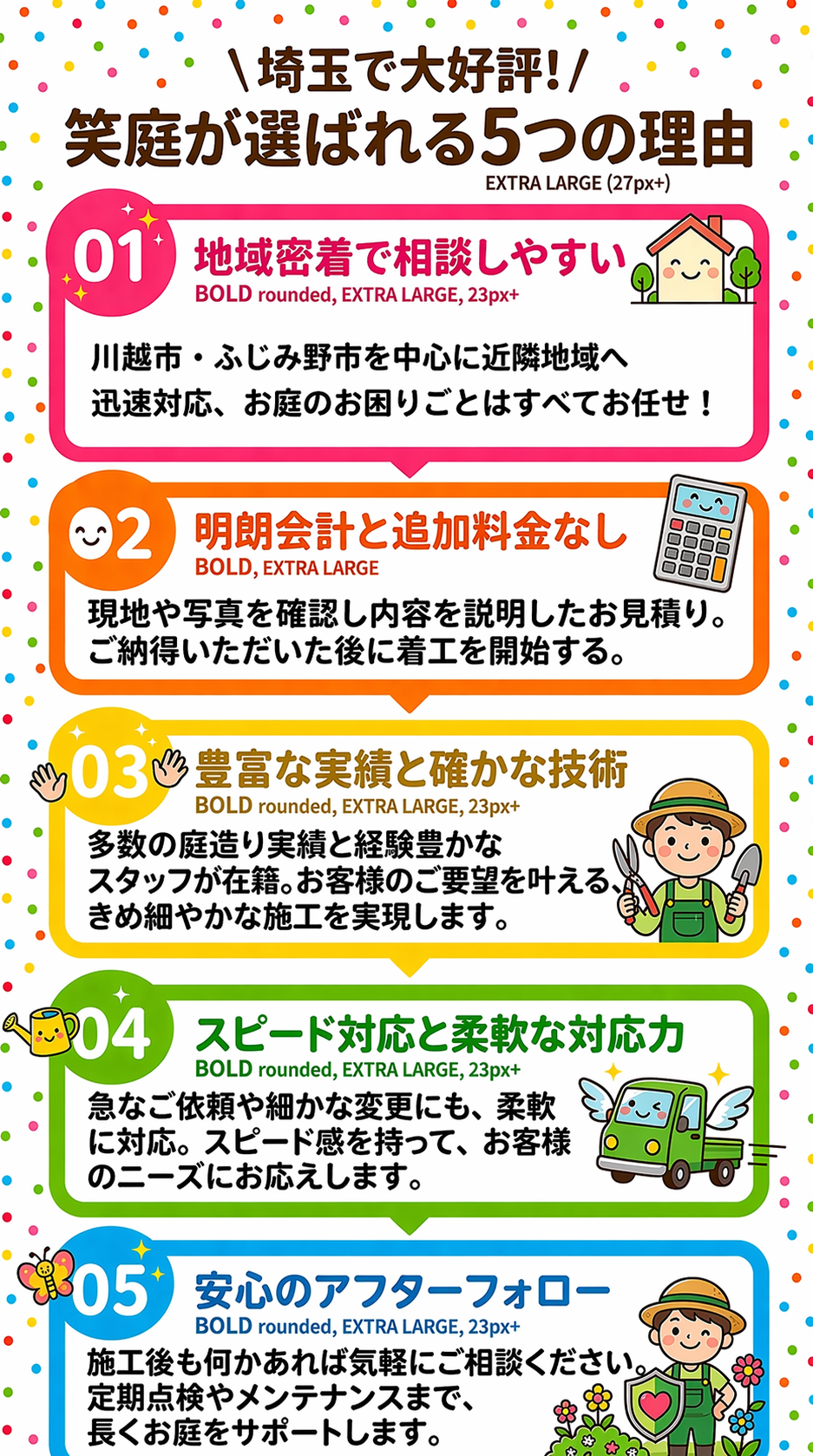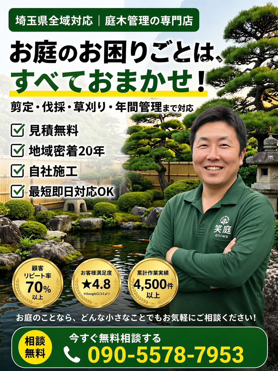 笑庭は地域密着を活かしたスピード感を強みとしており、川越市・ふじみ野市を中心に対応しています。
