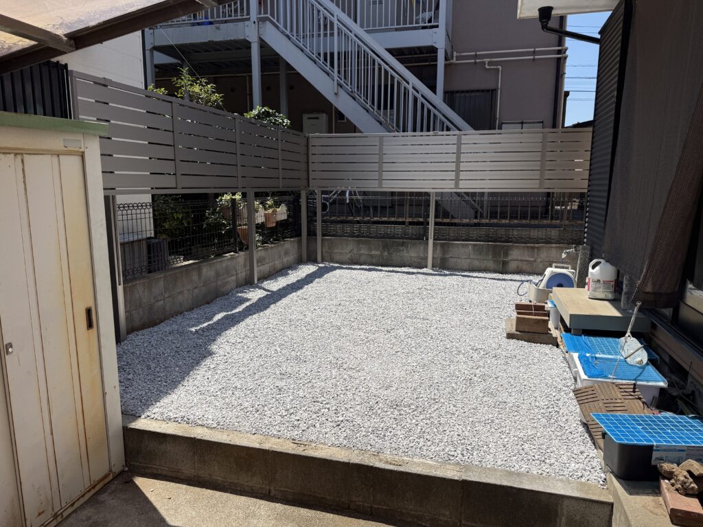 今回の作業では、木々を伐採抜根し、雑草もしっかり除去したのち、防草シートを敷いて白砂利を敷きつつ、最低限の目線隠しのフェンスを取り付けました。見た目もすっきりし、お庭も明るくなりました。